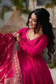 Pink Layered Plain Anarkali Gown With Pant & Dupatta Set